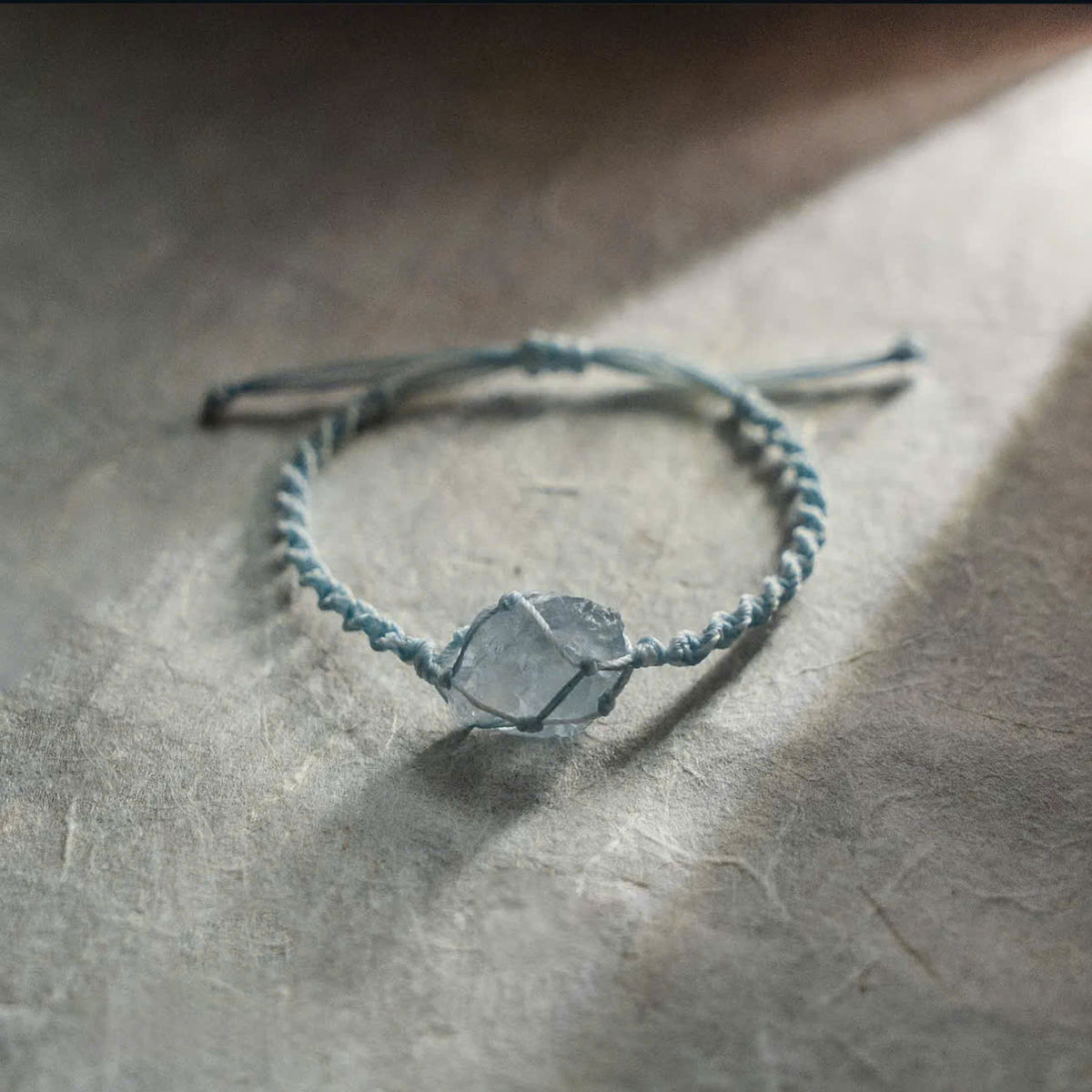" Sản phẩm được làm thủ công, viên đá AQUA thiên nhiên thô được chọn lọc kĩ lưỡng để tạo lên một chiếc vòng phong thuỷ "